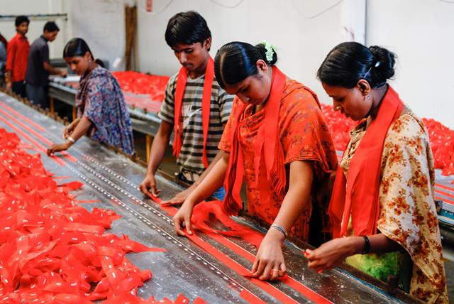 Dhaka, Bangladesh: work at a textile factory producing clothing for export. [photo: Joerg Boethling / Alamy]