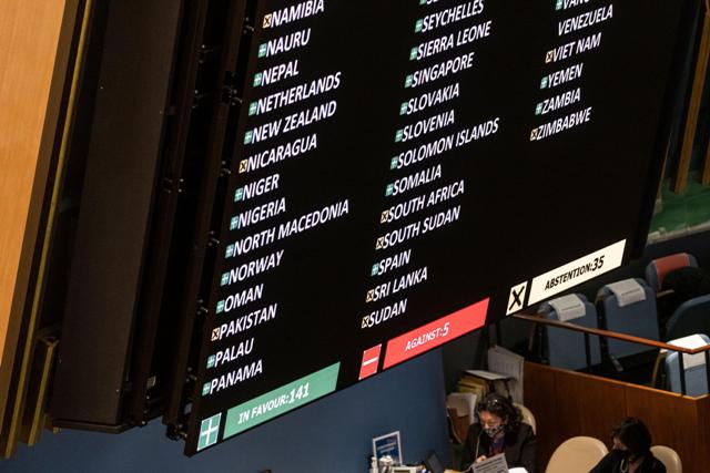 Members' votes on the resolution to condemn Russia’s invasion of Ukraine displayed on the big screen at the emergency session of the UN General Assembly. [photo: © Lev Radin/Pacific Press via ZUMA Press Wire/ Alamy]