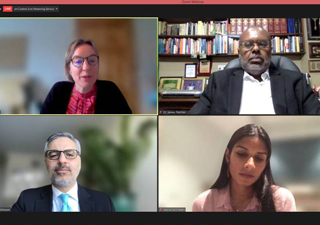 Webinar panel (clockwise from top left): Dr Tara Shine, Dr James Fletcher, Sabra Noordeen and Dr Payam Akhavan.