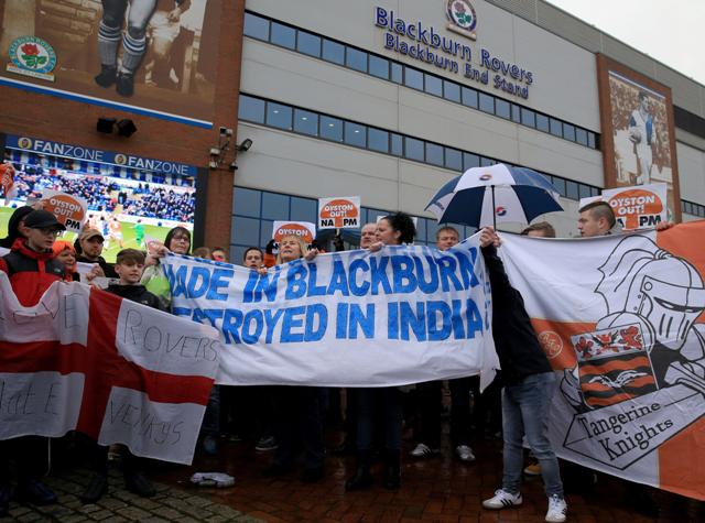 Blackburn Rovers and Blackpool fans stage a protest in 2017 outside the ground during the FA Cup Fourth Round game at Ewood Park. [photo: Alamy]