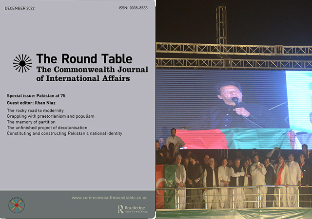 [l] Cover of Pakistan at 75 Round Table Journal special. [r] Ousted Prime Minister Imran Khan speaks to supporters in 2022 [photo: Alamy]