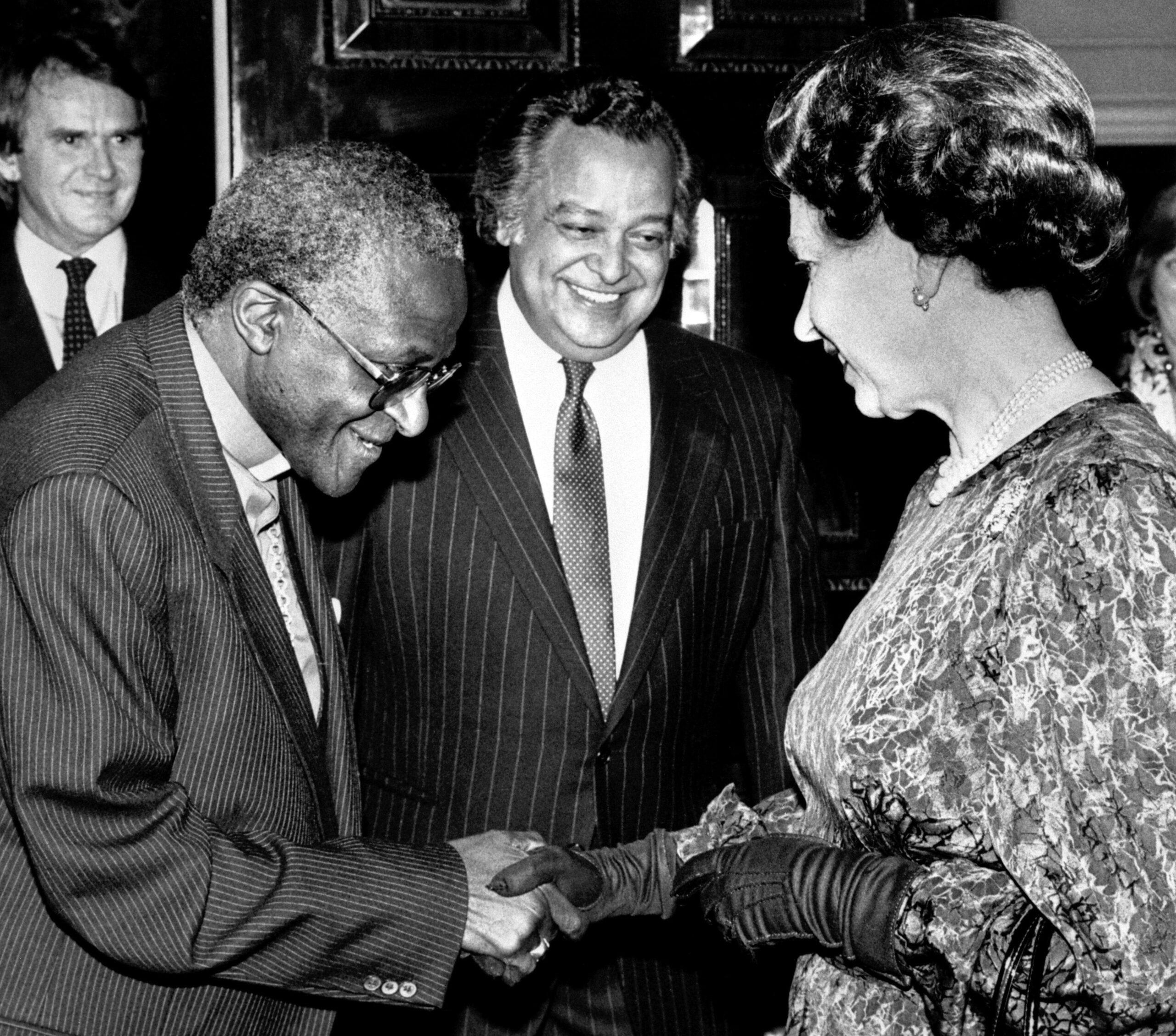 File photo dated 09/03/87 of Queen Elizabeth II meeting the Anglican Archbishop of Cape Town, Desmond Tutu at a Commonwealth Day Reception at Marlborough House, London, with Sir Shridath Ramphal, Secretary-General of the Commonwealth, looking on. Desmond