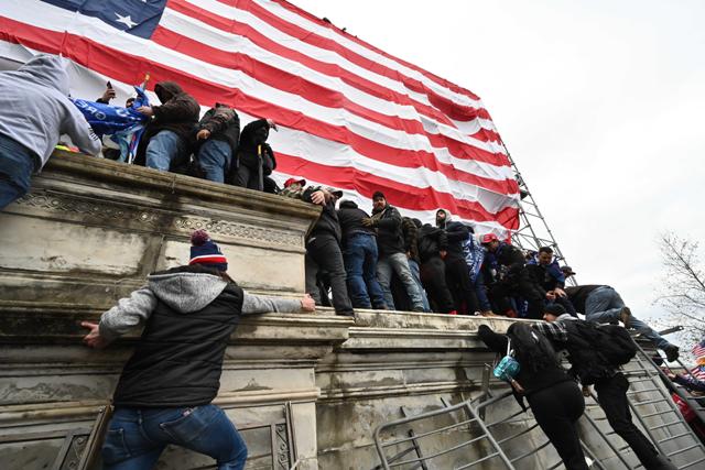 Protesters use barricades as ladders as they storm the US Capitol on a day where thousands of pro- Trump supporters rallied on 6 January. [Photo: Alamy]